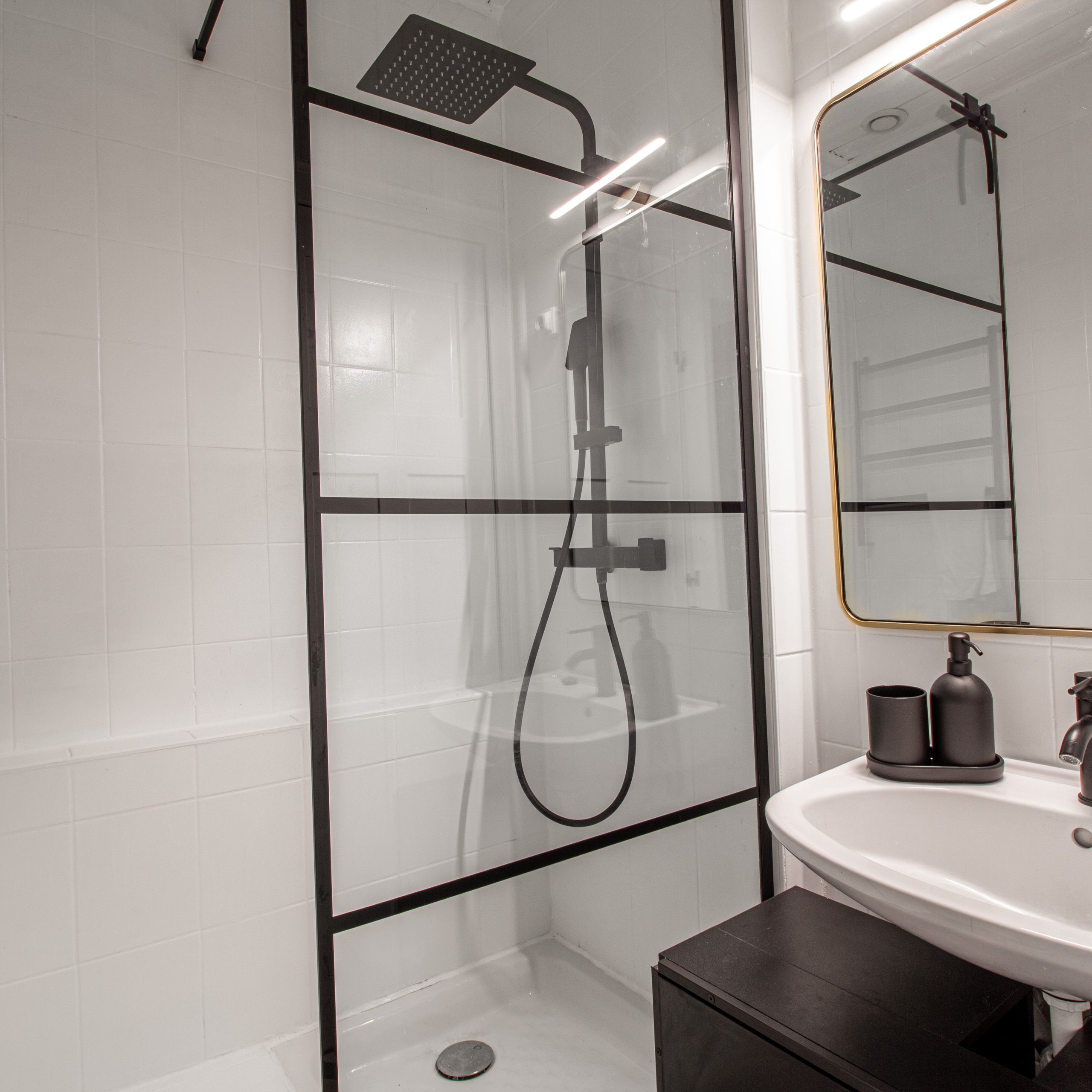 Une salle de bain moderne avec douche à l’italienne, meuble vasque et sèche-cheveux.